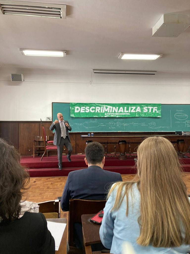 Fixada à lousa da sala de aula, uma faixa verde com quatro metros de extensão trazia a palavra de ordem “descriminaliza, STF”, em referência a um julgamento que discutirá se o porte individual de drogas deve ou não ser considerado crime e está pautado para a próxima quarta-feira (24).