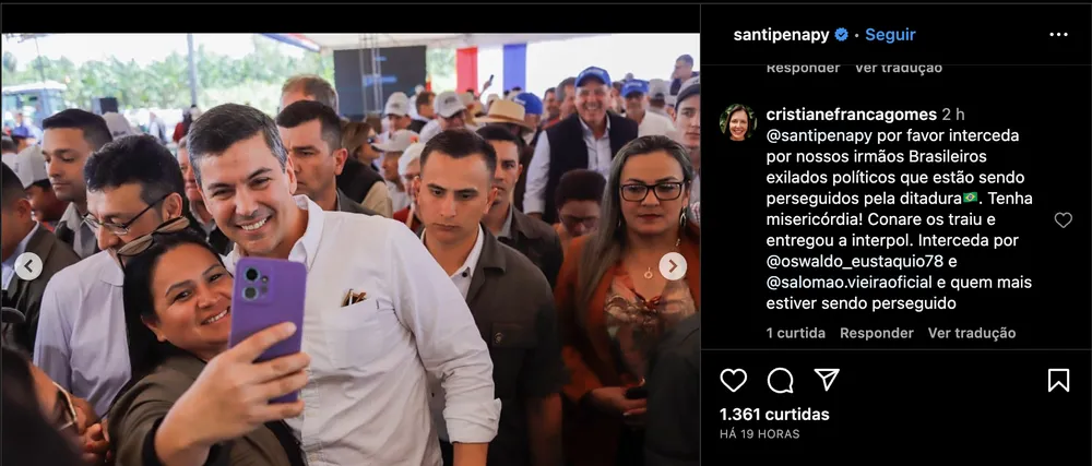Na live, os bolsonaristas também pedem que apoiadores acessem o perfil do presidente do Paraguai Santiago Peña e para que ele conceda asilo a outros foragidos por conta dos ataques do 8 de janeiro que estão no país. No perfil de Peña nas redes sociais é possível ver alguns desses apelos.