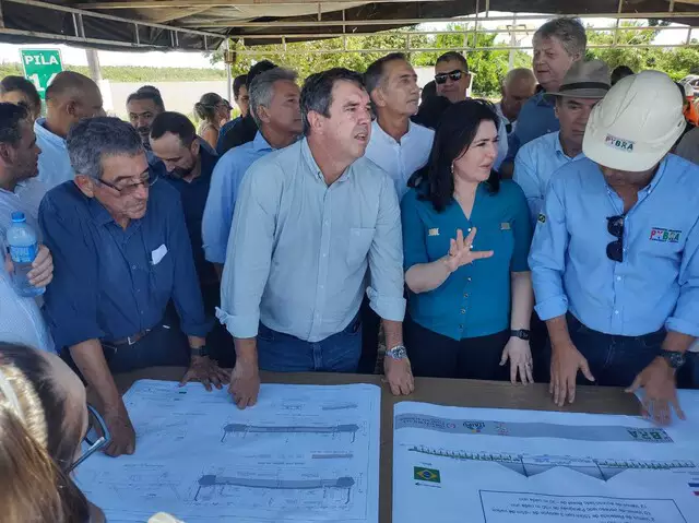 Com termômetro apontando 37 graus e sensação térmica de mais de 40, os ministros do Orçamento e Planejamento, Simone Tebet, e o da Integração e Desenvolvimento Regional, Waldez Góes, o governador Eduardo Riedel e uma comitiva de autoridades visitaram no final da manhã a margem do Rio Paraguai, em Porto Murtinho, para conferir a evolução da obra de construção da ponte sobre de acesso à Rota Bioceânica. O grupo passou parte da visita sob uma tenda, mas também foi até os pilares da ponte e apontou a necessidade de acelerar os esforços para garantir a conclusão das obras até o final de 2025.