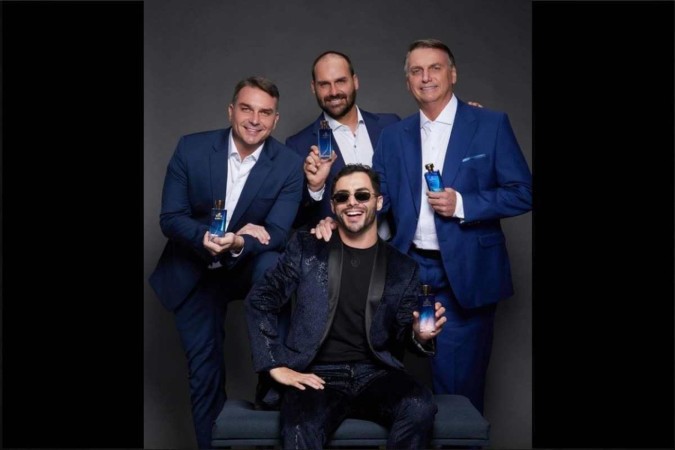 Em um post no Instagram na madrugada desta quinta-feira (30/5), a ex-primeira dama, Michelle Bolsonaro, divulgou a nova campanha para o perfume “Mito”. O lançamento do produto não é uma novidade, já que Michelle e o empresário e maquiador Agustin Fernandez já estavam divulgando a fragância nas redes sociais. O que surpreendeu os seguidores, contudo, foi a presença dos filhos do ex-presidente Jair Bolsoanro — Eduardo e Flávio — no post.