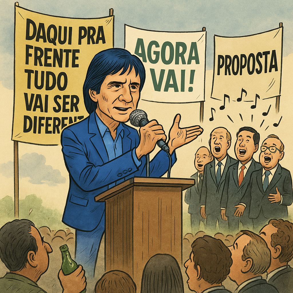 E o povo, sempre chamado de “amigo de fé, irmão camarada”, hoje é apenas público-alvo — plateia de um show de playback cívico, onde cada candidato canta “eu te amo, te amo, te amo” até o horário eleitoral acabar.