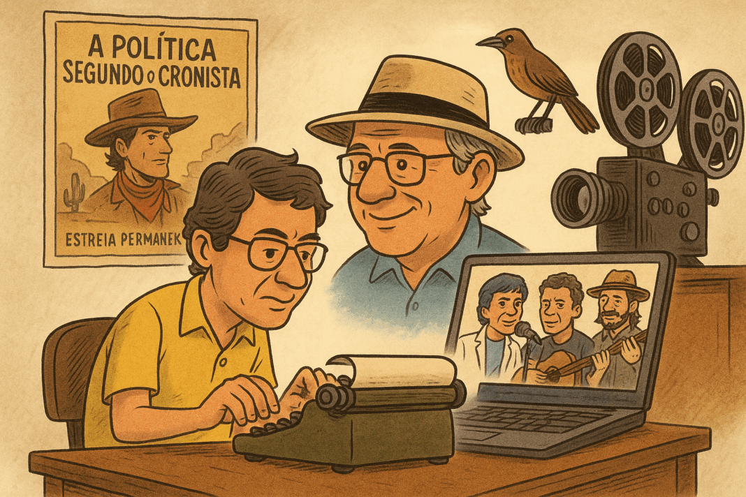 Foi daquela brincadeira de transformar programação de cinema em narrativa que nasceu o hábito de traduzir a realidade por metáforas — de costurar o noticiário com a imaginação, misturando política, música e humor no mesmo rolo de filme.