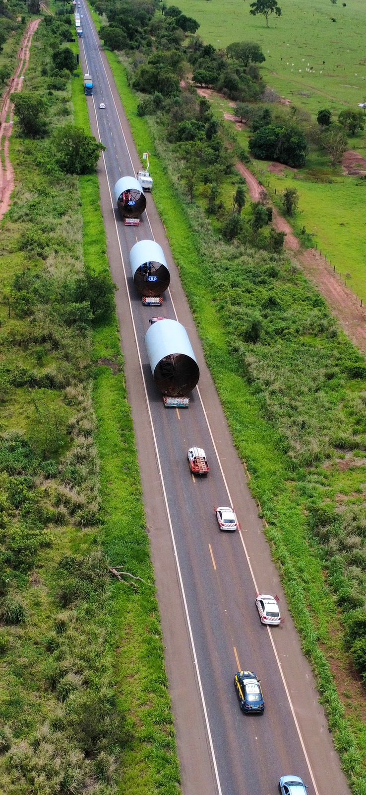 A logística do empreendimento é coordenada pela Valmet, empresa responsável pelos equipamentos e tecnologias da planta, e envolve uma cadeia global que abrange 18 países em três continentes, como China, Finlândia, Alemanha, Índia, Japão, Estados Unidos e Vietnã. A distribuição das cargas pelo modal marítimo será feita principalmente pelos portos de Santos (SP) e Paranaguá (PR). O porto paulista receberá cargas específicas, como o gigantesco “balão da caldeira”, enquanto Paranaguá concentrará a maior parte dos equipamentos especializados. A partir daí, as carretas seguem pelas rodovias federais e estaduais do país até Inocência, em transportes que exigem escoltas, intervenções estruturais e planejamento detalhado devido ao tamanho e peso das cargas.