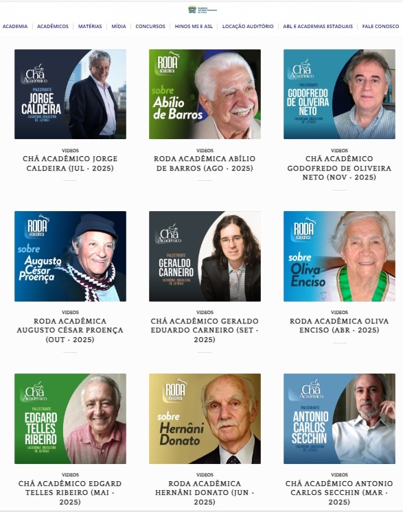 Os nove encontros do ciclo “ABL na ASL: Palestras Imortais”, promovidos ao longo de 2025 pela Academia Sul-Mato-Grossense de Letras (ASL), já estão disponíveis gratuitamente em vídeo no portal da instituição. Realizados no auditório da Academia, os eventos integraram as tradicionais edições dos Chás Acadêmicos e Rodas Acadêmicas, reunindo escritores, pesquisadores e público interessado em temas literários e culturais.