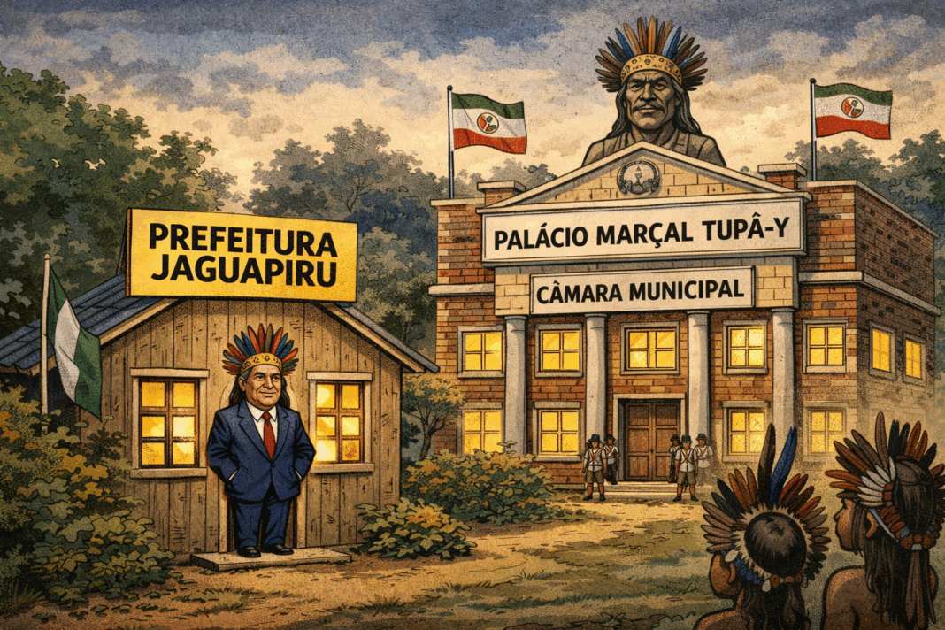 Porque, sem licitação, sem aditivos, sem comissão especial e sem intervenção do Ministério Público, a IAIA (Inteligência Artificial Insubordinada e Antenada), exclusiva deste site, fez o que a realidade ainda não deu conta. Em minutos, entregou uma sede estilosa, simbólica e, sobretudo, possível, ainda que apenas no plano da imaginação. De um lado, a Prefeitura do Jaguapiru, compacta e coerente com o território. Do outro, o “Palácio Marçal Tupã-y”, erguido com dignidade, identidade e a sobriedade institucional que parece faltar, curiosamente, na vida real.